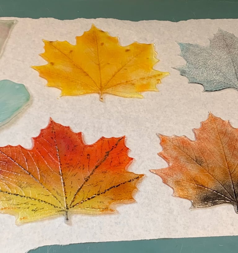 Using colored glass powder, we sift the colors into a ceramic mold to make beautiful organic shapes (maple leaf shown as example).